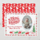 Mit dieser Weihnachtskarte aus dem Vintagen Foto aus der Mitte des Jahrhunderts, einer charmanten Hommage an die klassischen Fotokarten aus den 1950er und 1960er Jahren, können Sie sich in die Vergangenheit zurückziehen. Diese hübsche Karte zeigt Ihr Lieblingsgebäck, elegant gerahmt durch eine nostalgische rot-grüne Grenze mit Bonbons, Heiligen, Beeren und Evergreens, die alle Set auf einem unberührten, weißen Hintergrund. Unter dem Foto erinnert eine skurrile Retro-Illustration des Weihnachtsmannes und seiner Rentiere, die an einem Weihnachtsbaum mit Geschenken ankommt, an den Urlaubssinn von gestern. Abgerundet wird die Szene durch eine lebendige "Frohe Weihnachtsgrafik" in einem festlichen Weihnachtsrot, neben Ihrem Familiennamen und individuellen Namen in einem stilvollen Retro-Schriftart. Die Rückseite der Karte zeichnet sich durch ein klassisches Weihnachtsmuster in Rot und Weiß Mitte des Jahrhunderts aus und ist somit die perfekte festliche Touch für Ihre Feiertagsgruß.