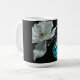 An imaginary gemstone flower composed of a turquoise bud, tiny pearls, and white petals covers this mug.