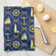 Dieses klassische nautische Design verfügt über Gold-nautische Elemente, Leuchtturm, Schiffsrad, Anker und Segelboot, gerahmt durch Goldseil mit nautischen Knoten vor marinebaublauem Hintergrund.