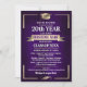 Große Wiedersehen-Einladungen in Ihren Schulfarben lila und goldfarben, die Sie mit all Ihren Festdetails für Ihre große Wiedersehen-Veranstaltung personalisieren. Dieses Design bietet einen reichen Hintergrund mit goldenen Eckakzenten und einem goldenen Graduierungspapier und -tasle, die an die Veranstaltungsdetails grenzen. Ihr Schulname wird auf einem goldenen Banner direkt in der Mitte deutlich hervorgehoben.
