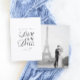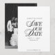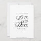This classy elegant save the date card in black and white features a minimalist design with "save our date" styled in a mixture of classic text and elegant calligraphy script that lends a sophisticated, classy style with old money vibes. The design also features a place to add your photo that covers the entire back of the card.