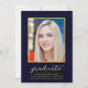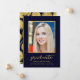 Mit dieser eleganten Ankündigung des Foto Abschlusses, die das Wort "Graduate" in einem stilvollen Drehbuch in Imitaten mit Goldfolie vor einem dunkelblauen Hintergrund mit einem Imitat goldenen Rahmen um das Foto. Die Karte hat ein Imitat mit goldenen Folienketten auf der Rückseite mit dunkelblauem Hintergrund. Personalisieren Sie es, indem Sie den Platzhalter-Text ersetzen und das Foto für die Auswahl/den Platzhalter durch Ihr eigenes Foto ersetzen. Für weitere Optionen, wie zum Beispiel den Schriftart zu ändern und ihn zu vergrößern oder zu verändern, klicken Sie auf den Button "Anpassen". *Bitte beachten Sie, dass das Zazzle-Wasserzeichen in der Zoomvorschau NICHT auf dem gedruckten Endprodukt © Rosewood and Citrus erscheint