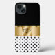 Classy smartphone case in an elegant and stylish design including simulated gold design elements digitally printed on the cover, chic black and white polka dots, and monogram name initials you can personalize and make your own. Designed for ladies or girls who like to carry their cellphone in style.