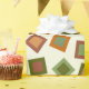 Die Quadrate sind in Orange- und Grüntönen gestaltet, die hellgelbe Hintergrundfarbe kann geändert werden.