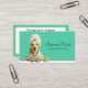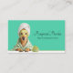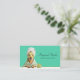 Eine lustige, einfache Visitenkarte mit einem in ein Handtuch gewickelten Hund, der eine Augenmaske trägt, mit ausgestreckten Pfoten, die zum Verwöhnen bereit sind. Auf einem aquamarinen grünen Hintergrund präsentiert. Es gibt genügend Platz, um Ihre Geschäftsdaten nach Belieben hinzuzufügen.
