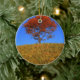 Eine friedliche 3D-Landschaft im Herbst, geschaffen in Vue. Auf einem Hügel, der von einem großen, goldenen Gras bedeckt ist, steht ein einziger orangefarbener Ahorn mit einer Holzbank, um zu stoppen und Erholung zu machen.