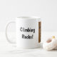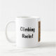 Augenfaszinierendes Bild der Kletterausrüstung an einem Brett außerhalb der Bergwerkswerkstatt. Roter Helm und schwarze Eislauge inmitten einer farbenfrohen Karabiner-Ausstellung. Mit "Climbing Rocks!" Slogan, oder wählen Sie "anpassen", um Ihre eigenen hinzuzufügen.