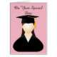 Cette carte de voeux présente une photo de jeune fille vêtue de casquette et de robe pour l'obtention de son diplôme. Avant de la carte dit, "On Your Special Day" et à l'intérieur dit, "Que votre avenir soit brillant, Nous sommes si fiers de vous, Félicitations pour votre diplôme!" Une carte sucrée à envoyer à un membre de la famille ou à un ami!