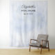 Eine elegante, moderne Brautparty-Kulisse mit Cloud 9, mit pastellblauen Hintergrund mit weißen, flauschigen Wolken, moderner Schriftzeichen-Kalligraphie und sauberer, moderner Typografie.