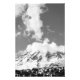 Ein Schwarz-Weiß-Foto des Berges Rainier mit Wolken, die sich am Gipfel bilden und sammeln. Eine Reihe von Wolken sind dem Griff des Vulkans entkommen und steigen weiter hinauf in den Himmel. Schnee bedeckt noch die Landschaft, und das Baumwachstum streut über den Vordergrund. Image Copyright ©2023 Kimberly J Tilley. zazzle.com/store/developingnature