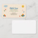 A pastel color business card for a child care service featuring playful elements. Colorful building blocks, cloud, smiling sun, and small handprints are scattered around the edges as decorative elements. It might work well for any activity involving children, including tutoring, nanny and babysitting.