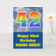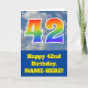 Die Vorderseite dieses lustigen 42. Geburtstagskarten-Designs zeigt eine wolkige blaue Himmelsdarstellung, zusammen mit der Zahl "42" mit einem farbigen Regenbogenspektrum wie Gradientenmuster. Auf der Vorderseite befindet sich auch eine Geburtstags-Grußbotschaft mit einem bearbeitbaren Empfängernamen. Im Inneren befindet sich eine individuell angepasste Geburtstagsgrüßbotschaft, oder man könnte sie löschen und leer verlassen werden, wenn eine Nachricht von Hand geschrieben werden soll. Eine solche individuelle Geburtstagskarte könnte eine lustige Art sein, Geburtstagswünsche an jemanden zu senden, der seinen vierzigsten Geburtstag feiert. [~Z0000370]