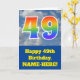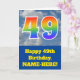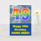Die Vorderseite dieses lustigen 49. Geburtstagskarten-Designs zeigt eine trübe blaue Himmelsdarstellung, zusammen mit der Zahl "49", die ein buntes Regenbogenspektrum wie Gradientenlook hat. Auf der Vorderseite befindet sich auch eine Geburtstags-Grußbotschaft mit einem bearbeitbaren Empfängernamen. Im Inneren befindet sich eine personalisierte Geburtstagsgrüßbotschaft, oder man könnte sie löschen und leer verlassen werden, wenn eine Nachricht von Hand geschrieben werden soll. Eine personalisierte Geburtstagskarte wie diese könnte eine lustige Art sein, eine Botschaft zum Feiern des neunundvierzigsten Geburtstages von jemandem zu senden. [~Z0000370]