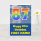 Die Vorderseite dieses lustigen 87. Geburtstagskarten-Designs zeigt eine Darstellung eines blauen Himmels mit Wolken, zusammen mit der Zahl "87" mit einem bunten Regenbogenspektrum wie Gradientenlook. Auf der Vorderseite befindet sich auch eine Geburtstags-Grußbotschaft mit einem bearbeitbaren Empfängernamen. Im Inneren befindet sich eine benutzerdefinierte Geburtstagsgrüßbotschaft, oder man könnte sie löschen und leer verlassen werden, wenn eine Nachricht von Hand geschrieben werden soll. Eine individuell anpassbare Geburtstagskarte wie diese könnte eine lustige Art sein, Geburtstagswünsche an jemanden zu senden, der gerade seinen siebzigsten Geburtstag feiert. [~Z0000370]