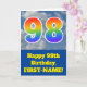 Die Vorderseite dieses lustigen 98. Geburtstagskarten-Designs zeigt eine Darstellung eines blauen Himmels mit Wolken, zusammen mit der Zahl "98" mit einem bunten Regenbogenspektrum wie Gradientenmuster. Auf der Vorderseite befindet sich auch eine Geburtstagsgrüßnachricht, einschließlich eines benutzerdefinierten Empfängernamens. Im Inneren befindet sich eine individuell anpassbare Geburtstags-Grußnachricht, oder vielleicht kann gelöscht und links werden, wenn eine Nachricht von Hand geschrieben werden soll. Eine personalisierte Geburtstagskarte wie diese könnte eine lustige Art sein, eine Botschaft zum Feiern des achtundneunzigsten Geburtstages von jemandem zu senden. [~Z0000370]