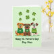 This greeting card shows three smiling, human-like dogs sitting shoulder to shoulder on a gently curved emerald-green base, their matching green-rimmed glasses making them look like a close little crew. Above them, seven four-leaf clovers float across a pale green background in deeper forest tones, like confetti drifting overhead ☘️. The left dog has a warm ginger coat and wears a solid green sweater with a white shamrock on the chest, leaning slightly toward the others as if posing for a friendly photo. In the center, a chocolate-brown pup wears a green bandana with a clover, its open-mouthed grin turned toward its pals in an easy, affectionate way 💚. On the right, a speckled white-and-brown dog finishes the trio in a striped sweater with two shades of green, adding a cozy contrast to the softer backdrop. The greeting text, “Happy St. Patrick’s Day! Step Mom,” sits below the dogs in dark green, centered near the bottom to anchor the layout. The clovers vary in size and spacing, with a few near the top edge and others hovering closer to the dogs against the light green field.