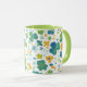 Diese skurrile Abbildung zeigt eine Reihe von bunten Kleeblatten und kleinen Blume, die auf einem weißen Hintergrund verteilt sind. Die Kleeblatten sind in verschiedenen Grüntönen dargestellt, einige mit Texturen und subtilen Farbtönen. Zwischen den Blumen sind hellblaue und gelbe Blumen verstreut, was dem Muster eine lebendige Touch verleiht. Das Gesamtbild strahlt ein fröhliches und spielerisches Ambiente aus, das an eine belebte Wiese im Frühling erinnert.