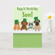 Designed with four cute cartoon animals peeking over a bright white ledge, this St. Patrick’s Day scene feels friendly and a little affectionate, like they’re leaning in to greet someone special. From left to right, there’s an orange tabby cat with green eyes, a brown dog with wide, gentle eyes, a gray-and-white cat with blue eyes and a small green bow tie, and a fawn-colored dog with a wrinkly face and an earnest look. Three of them wear tall emerald top hats with gold buckles, adding a festive touch that pairs nicely with the soft green theme 💚. The background is a pale mint green with a repeating pattern of small three-leaf clovers ☘️, giving the setting a light, airy feel. Near the top, the message “Happy St. Patrick’s Day, Son!” is set in large green letters, centered above the animals. Their faces are turned straight toward the viewer, with tender expressions that suggest warmth and closeness without needing any extra decoration. The white ledge runs horizontally across the lower part of the design, separating the characters from the clover-patterned background.