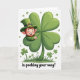 This card features a cheerful leprechaun peeking from behind an oversized four-leaf clover, his rosy cheeks and pointed ears framed by a wide, friendly grin that feels like a wink shared with a close friend 💚. He wears an emerald-green top hat with a gold buckle and a matching green jacket dotted with shiny gold buttons, giving him a tidy, storybook look. The giant clover fills most of the scene in layered green tones, curling around him like a cozy backdrop that draws you in ☘️. A bright white background keeps the greens and warm skin tones standing out, while small shamrocks drift around the page like confetti. Near the bottom, a short strip of stylized grass grounds the picture and adds a gentle outdoor touch. The greeting text sits low on the card in dark lettering, easy to spot against the pale background and neatly aligned beneath the main illustration. A few tiny shamrocks float near the top corners, with the largest clover centered behind the leprechaun’s hat and shoulders.