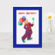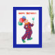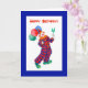 Eine helle und fröhliche altersspezifische Geburtstagskarte für einen 4-jährigen, mit einem Clown, der Ballons trägt, aus einer handbemalten Illustration von Judy Adamson. Bitte ändern Sie den Insider-Text nach Ihren Wünschen.