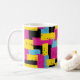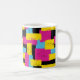 Ein gewagtes, helles, geometrisches, farbiges Blockmuster mit mehrschichtigen, texturierten, grausamen Farbrechtecken und Quadraten in Cyan, Magenta und Gelb vor schwarzem Hintergrund.