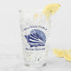 Die Muschelkunst aus blauem und weißem Konkast schmückt dieses thematische Glas an der Küste. Ein Familienname liegt oberhalb der Muschel mit dem Text "Beach Hütte" unten. Entworfen von dem weltbekannten Künstler Tim Coffey.