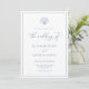 This simple minimal chic coastal blue beach wedding invitation design has a scallop shell at the top, elegant script calligraphy, and a frame around the edge.