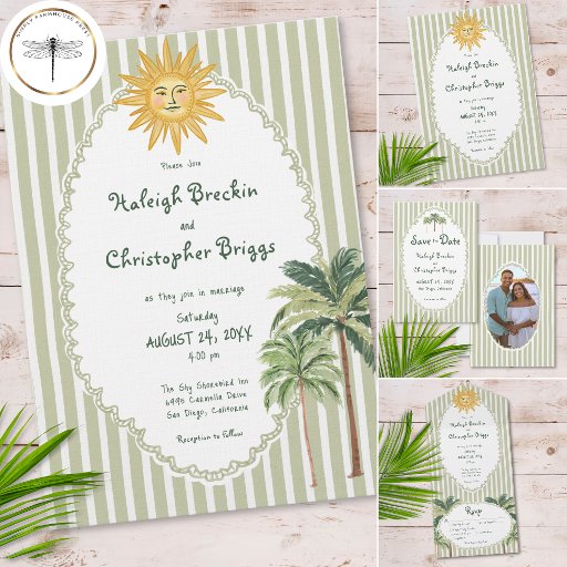 This whimsical coastal wedding all in one wedding invitation with a QR code features a vintage sun motif, lace border, palm tree, and stylish sage green stripe background. Perfect for a beach or California destination wedding. Created by Simply Farmhouse Press.