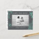 Eine moderne Hochzeitsfeier zum Thema Foto an der Küste bewahrt den Datums-Postkarte personalisiert mit Ihrem Foto und Hochzeitsinformationen umgeben von winzigen Aqua-Meeresfrüchte-Korallen und Seestern Elemente über einen reichen grauen Hintergrund. Schwarz-Weiß-Fotos sehen besonders gut aus, aber Sie können auch ein Foto verwenden, wenn Sie es vorziehen. Auf der Rückseite dieser Postkarte befindet sich eine Beispielmeldung, die Sie mit Ihrem gewünschten Text personalisieren können.