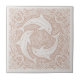 This intricate, vintage-inspired design features three graceful dolphins swimming in a circular, yin-yang-like arrangement. The dolphins, rendered in crisp white, are set against a richly detailed soft coral background filled with elegant swirling scrolls, delicate dots, and organic maritime motifs suggesting waves and bubbles. The whole image is framed by a highly decorative, square border featuring sophisticated floral and baroque elements. Perfect for adding a touch of classic, Mediterranean, or coastal charm to any home decor item. Search ID1208 to see additional colors and design motifs in this series. Note: design may contain generative content