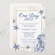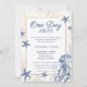 Celebrate "One Day Away" with this stunning Coastal Rehearsal Dinner Invitation. This design perfectly captures the essence of a Coastal Wedding or a luxury maritime event. It features a sophisticated navy blue and faux gold glitter palette with elegant watercolor illustrations of starfish, sea coral, and a graceful jellyfish. The intricate gold botanical frame highlights the details of your beach, yacht club, or seaside rehearsal dinner. The formal script font announces the honored couple. This template is ideal for couples planning an upscale summer or destination wedding.