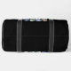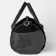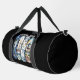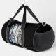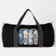 This black duffle bag features four vibrant vertical panels with watercolor-style coastal elements: a fish on an anchor, a sailboat on the water, a seashell with small fish, and a lighthouse with a dolphin, all under the text "COASTAL VIBES." Edit color of the bag caps and body in the Design tool to your favored colors.