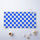 A blue and white checkerboard pattern with alternating squares fills the image, creating a geometric, balanced design with a classic, symmetrical feel.