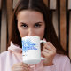 Eine beeindruckende Komposition tropischer Cobalt Blue-Aquarell-Blume und Blätter, große Protea-Blume in der Mitte, eine blaue Leidenschaft und mehrere Frangipanis schmücken diese klassische 15oz Kaffee-Tasse. Große Kapazität für warme oder kalte Getränke. Ändern Sie einfach den Namen, fügen Sie Text hinzu oder entfernen Sie die Vorlage. Weitere Informationen und Betreuung finden Sie unter "Über dieses Produkt".