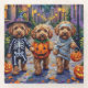 Adorable Cockapoos, gekleidet in verspielten Halloweenkostümen, tragen Kürbiseimer, während sie unter dem mondbeleuchteten Himmel tricksen oder sich behandeln. Dieses festliche Design hebt den flauschigen Mantel der Rasse, die liebevolle Natur und die fröhliche Persönlichkeit hervor, die perfekt die gespenstische und dennoch lustige Atmosphäre Halloween-Abends einfangen. Eine charmante Feier für Hundefreunde und Halloween-Fans gleichermaßen.
