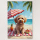 Ein fröhlicher Cockapoo genießt eine entspannte Strandszene mit hellen Farben, tropischen Früchten und sanften Ozeanblicken. Der malerische Stil schafft ein unterhaltsames und einladendes Sommergefühl.