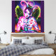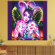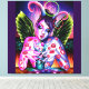 Das ist eine farbenfrohe, trippige, surreale Pop-Illustration eines Mädchens am Strand, das Cocktail oder Mocktail trinkt. Sie genießt heiße Sommervibes.