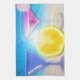 Farbiges Bar Handtuch mit zwei Gläsern im martinischen Stil, mit einer rosa Flüssigkeit in der einen und einer blauen Flüssigkeit in der anderen, und einer Zitronenscheibe dazwischen. Der hintere Boden sieht aus wie ein friedlicher Strand. Anpassen, um jeden gewollt Text hinzuzufügen.