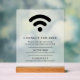 Un petit panneau pédagogique en noir et blanc subtil teinté arrière - plan (semi opaque) pour aider vos invités ou clients à se connecter avec de l'espace en haut pour votre propre logo ou utiliser le simple logo wifi fourni à la place. Une façon élégante d'aider vos invités à rester informés et wifi connecté, avec cette simple signalisation pédagogique textuelle, il suffit d'ajouter votre propre nom de réseau et votre code d'accès wifi. Idéal pour ajouter aux chambres d'hôtes de luxe, hébergement d'hôtel, location de maisons de vacances, Airbnb's, boutiques, cafés et restaurants. Logo et design par www.mylittleeden.com sur Zazzle.