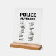 Ce tableau d'identification par alphabet de police Code phonétique est essentiel pour l'application de la loi, les répartiteurs et les stagiaires des écoles de police. Doté d'un alphabet phonétique complet, ce design offre une référence facile à lire pour une communication efficace dans des situations à enjeux élevés. Idéal pour les bureaux, les centres de dépannage ou l'utilisation à domicile, ce graphique est parfait pour toute personne qui valorise l'exactitude et la clarté des communications radio. C'est un cadeau judicieux pour les policiers, les premiers intervenants ou toute personne qui poursuit une carrière dans l'application de la loi.