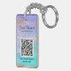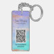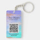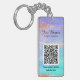 Sonnerie de clé de code QR entièrement personnalisable. Il s'agit d'un design recto verso avec un arrière - plan turquoise, violet et doré. Modifiez le nom et le titre, le code QR et le texte personnalisé des deux côtés.