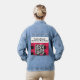 Faites la promotion de votre entreprise avec votre propre veste de denim personnalisée. Sur le dos de la veste branchée, sur un panneau de contrôle de buffle rouge, il y a un code QR que vous pouvez customiser pour pointer vers votre propre URL de site Web lors de la numérisation. Ci-dessus se trouve une section blanche que vous pouvez personnaliser avec le nom ou votre entreprise ou organisation. Cette veste est un moyen attrayant de promouvoir vos services, que vous soyez à l'extérieur gérant le bois, ou en ville chez un coiffeur branché. Pour continuer, cliquez sur "Personnaliser" pour ajouter vos propres mots et lien Web au design.