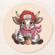 A cute cartoon cow sits sipping an iced coffee through a straw. She has brown and white spots, a pink scarf, and brown boots. On her head rests a red beanie with the words “Coffee Addict” written on it.