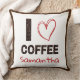 This decorative throw pillow features the phrase “I ♥ Coffee” with bold lettering filled with a stylish coffee bean pattern. The design also includes space for a custom name, making it a fun and personal piece of coffee-themed decor.