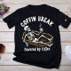 Faites une pause dans le style avec ce T-shirt décalé avec un squelette qui se dresse dans un cercueil avec une tasse de café, associé à l'expression "Coffin Break, Powered by Coffee". Un design parfait pour les amateurs de café avec un sens sombre de l'humour.