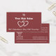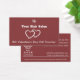 La carte cadeau de la Saint-Valentin pour coiffeur moderne fait partie de la collection Biz Cards & Marketing Salon Bourgogne White Hair Cards & Articles. Cette carte paysage présente du texte blanc sur un arrière - plan bordeaux avec deux coeurs. Le logo et le nom du salon sont alignés en haut du centre, avec le texte "$10 Valentine's Day Gift Voucher" en bas. À l'arrière, le côté gauche comprend un "Scan and Arrange!" CTA, un code QR pour la planification de rendez-vous facile, un identifiant de suivi : Love25, et une invitation à "Suivre" la poignée de médias sociaux du salon et le hashtag de Valentine. À droite, les coordonnées physiques. Un séparateur en bas met en évidence les termes : "Présentez cette carte pour 10 $ de votre prochaine visite | Aucune valeur en espèces | Expire XX.XX.20XX." Pour en savoir plus sur l'image de marque, visitez le site www.KBMD3signs.com. Pour obtenir de l'aide, contactez-nous à info@KBMD3signs.com.