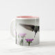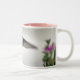 Des fleurs et un colibri s'étirent autour d'une tasse à deux tons.