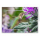 Une carte postale montrant une image rapprochée d'un colibri se nourrissant d'une jolie fleur violette.