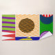 Ce kit de serviettes a un design Bauhaus de formes et de lignes faisant un collage dans les couleurs primaires et secondaires.