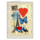 Vintage collage romantique de Paris avec la tour Eiffel, Paris France avec des valentines rouges aiment les ballons de coeur et joli papillon bleu et oiseau paon et fleur de lys, sur un arrière - plan de carte postale antique. Copyright Oconnart.
